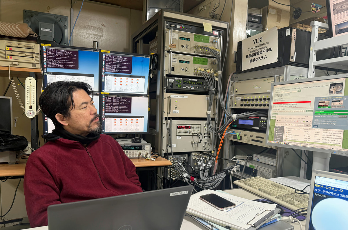 昭和基地にはこの観測のために、直径11mの多目的アンテナとメーザー原子時計が備えられています。機器が正確に動作しているかをリストを見ながら監視します。多目的アンテナとVLBI観測については前回のブログも参照いただければと思います。