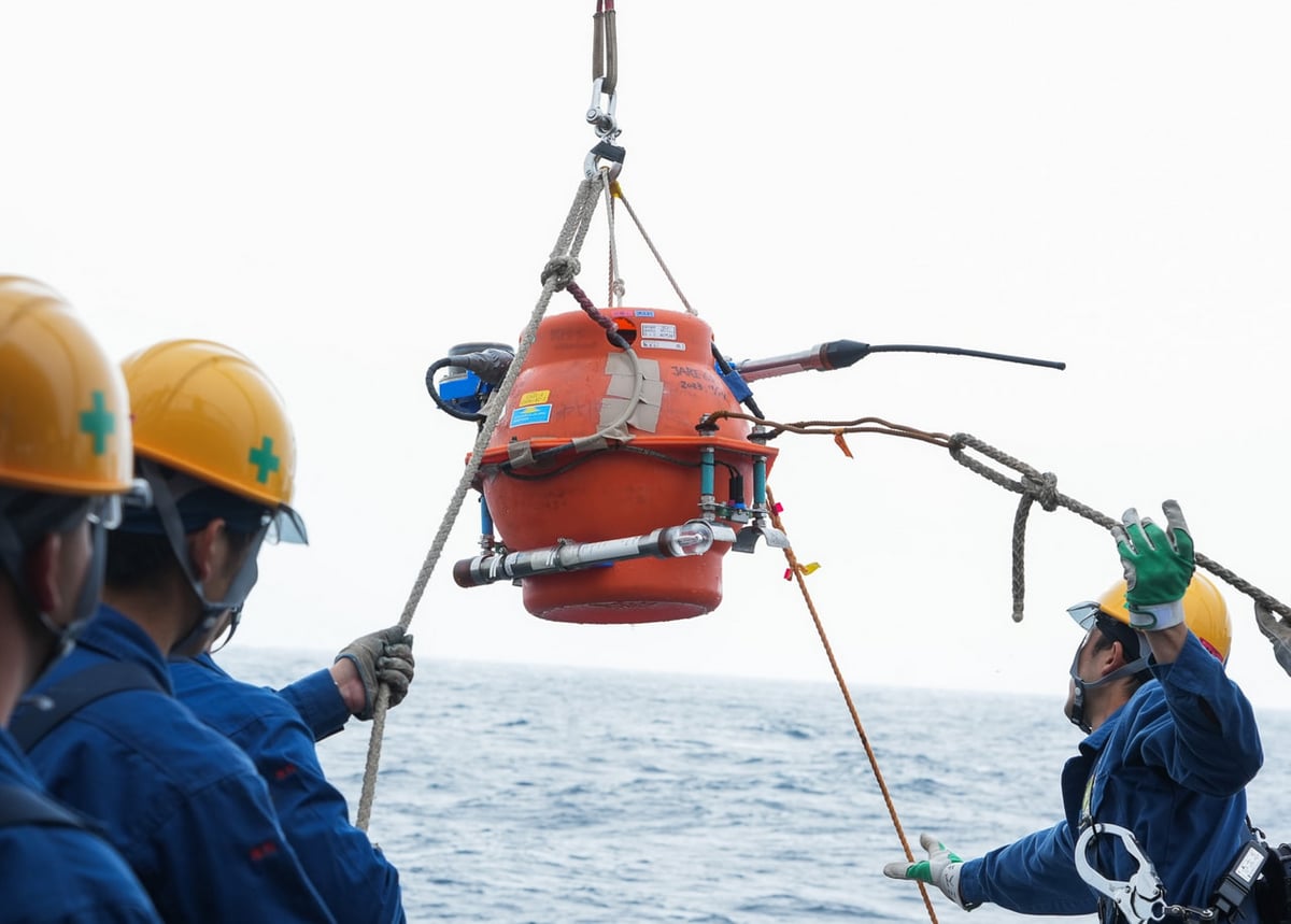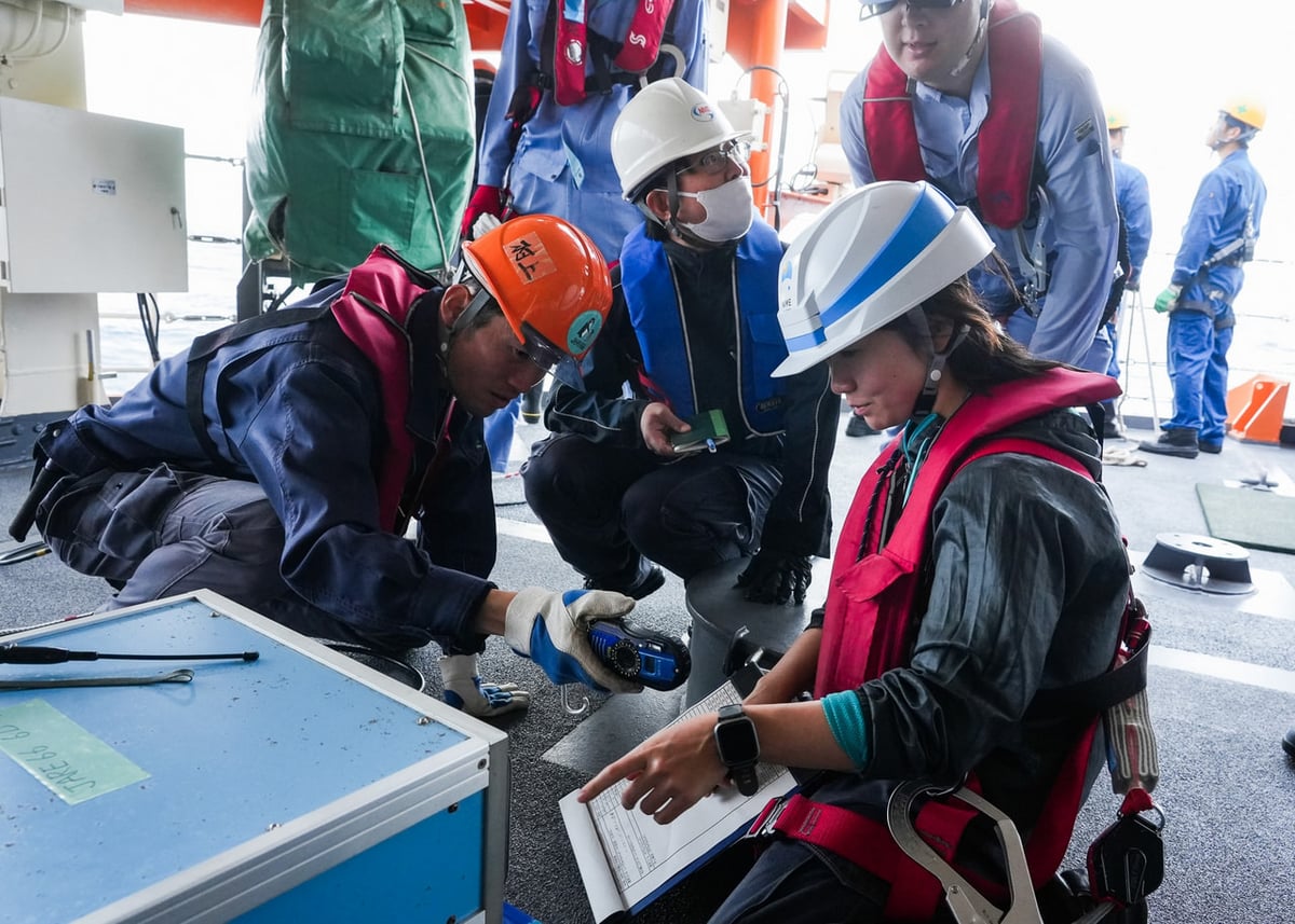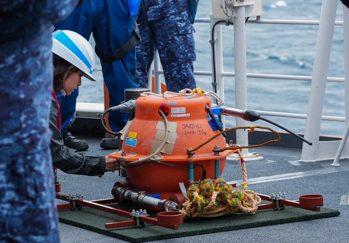 その後、直付け採水の訓練と海底圧力計の投入訓練が行われました。後者の海底圧力計は海の水位の変動を知るために使用する連続観測装置です。しらせの航路上で投入後、海底で1年以上データを取り続ける大変タフな装置で、役目を終えた後は船上から切り離しの指示を送り、本体の浮力で浮上してきたものをしらせ乗員・観測隊員総出で探して回収します。