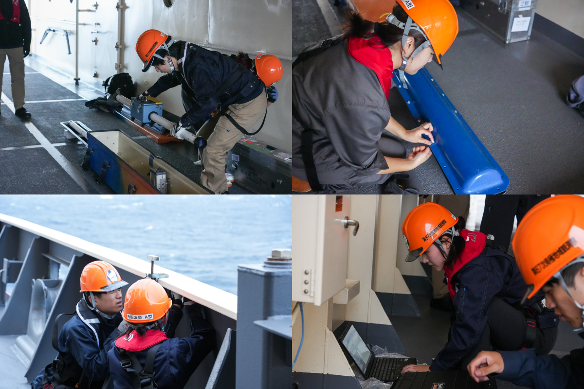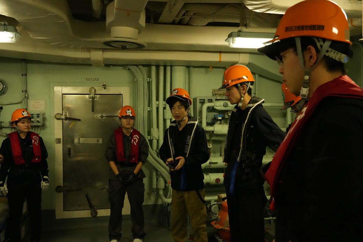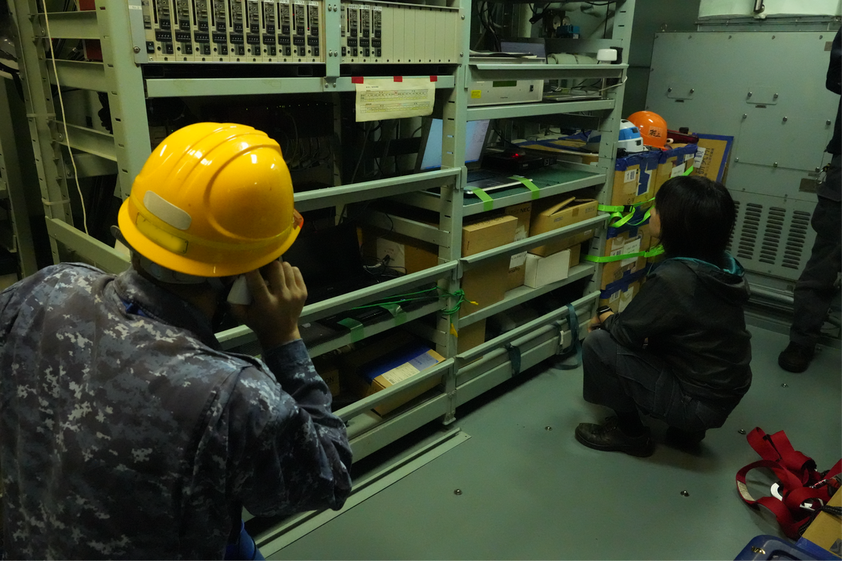 この日の海洋観測訓練は、「8の字航走」で終了となりました。今回の訓練航海には本航海に乗船しない研究代表者や過去の隊で経験のある隊員なども乗船しているため、この後は船内で各種引き継ぎや出発前の準備作業が行われました。