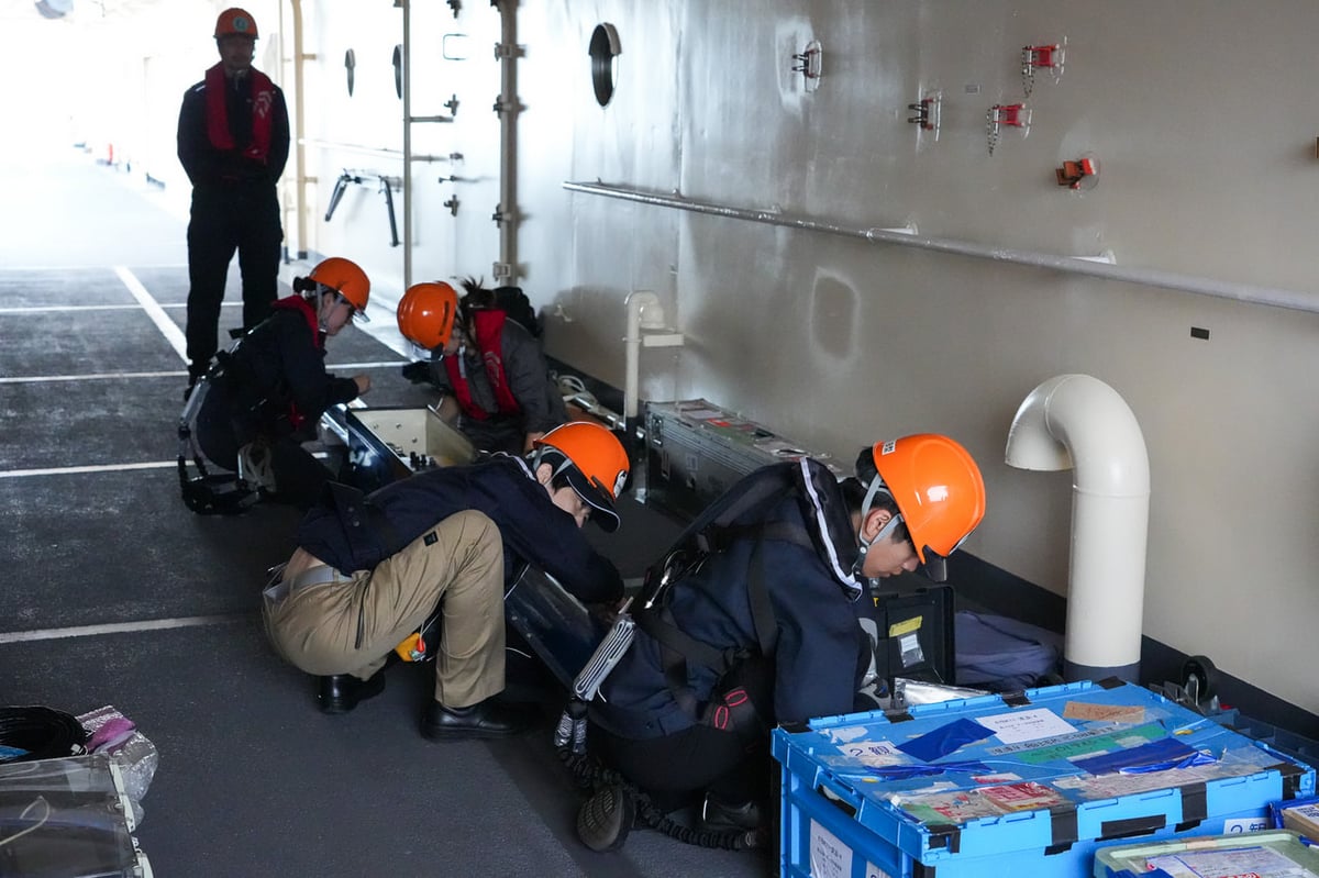 EMセンサーは「しらせ」の舷側に吊り下げ、海氷の厚みを測る装置です。吊り下げる部分だけでも約3mほどの長さがあり、屋内で組み立てを行うことが難しいため、各パーツを甲板に持ち出して作業をします。残念ながら強風のためEMセンサーの訓練は延期となってしまいましたが、強風吹き荒ぶ中の設営は南極出発前のよい予行演習になったようです。