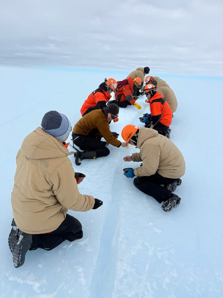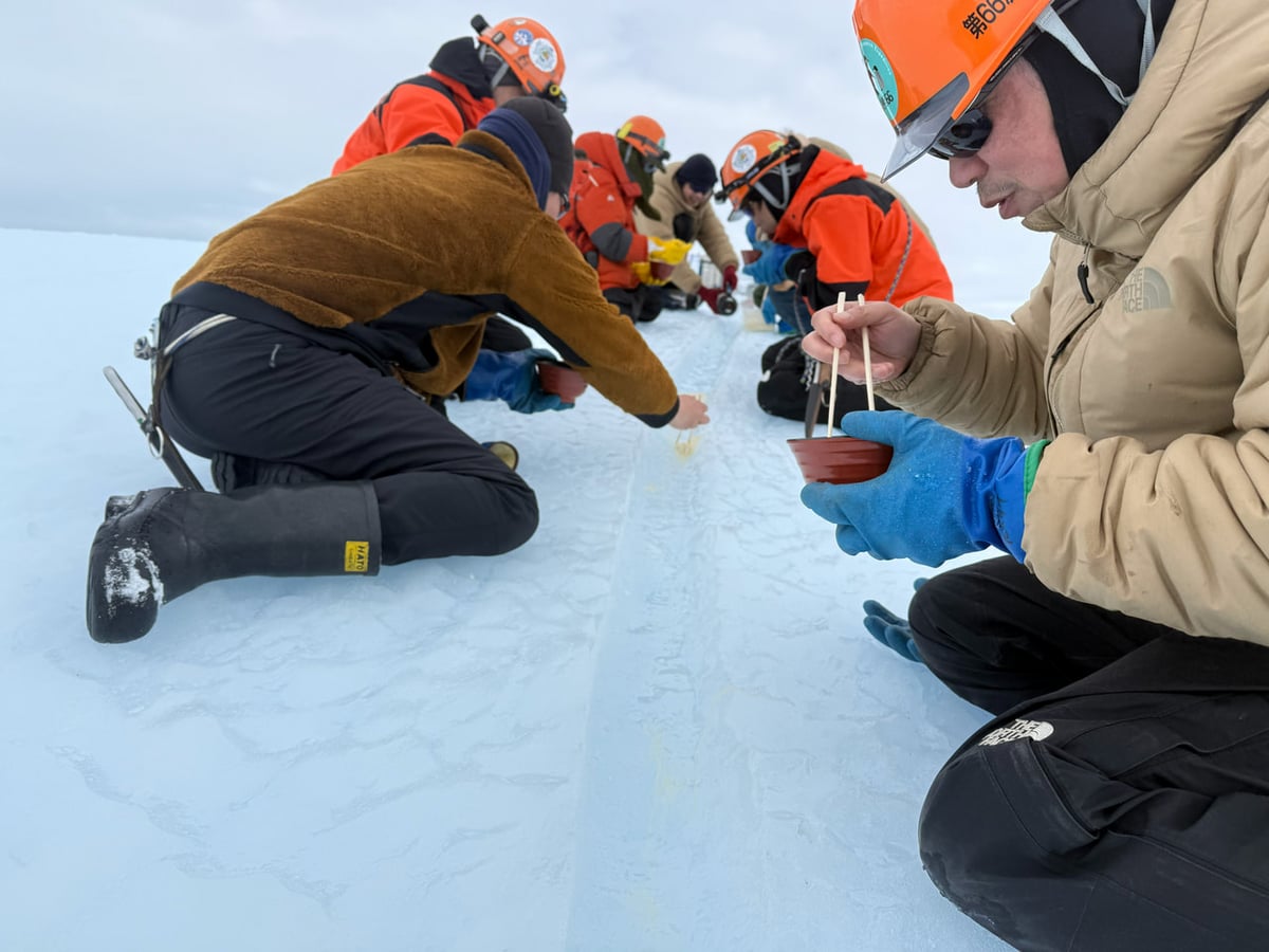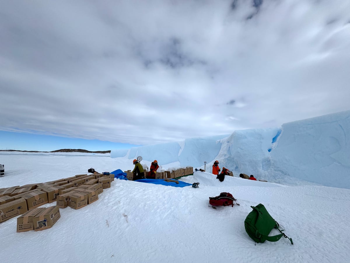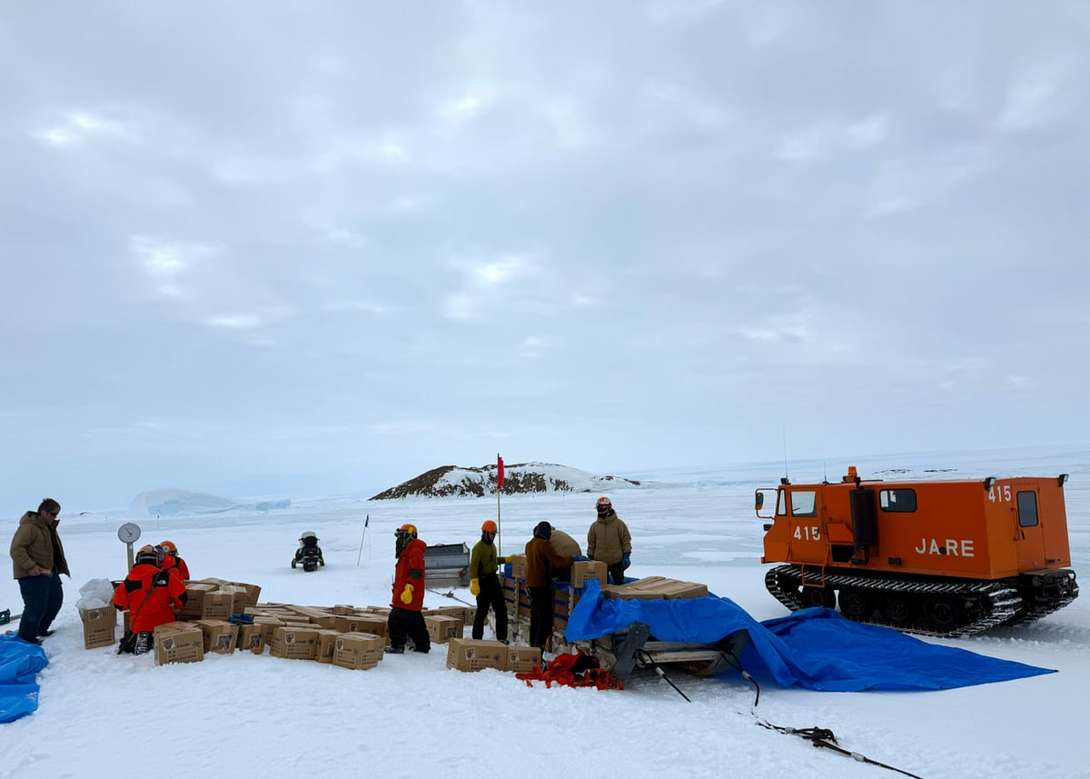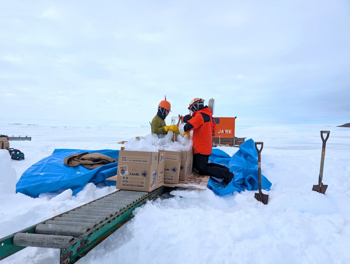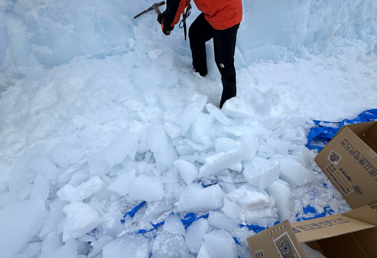 初めての作業でしたので最初は戸惑いながら氷を採取していましたが、これまでに培われたチームワークで予定時間よりも早く目標個数を採取することができました。砕いた氷を段ボール箱に入れ、計量して梱包します。雪上車でけん引してきた橇に搭載すれば完了です。帰国後に今回の氷が国内で活用されるのが楽しみです。