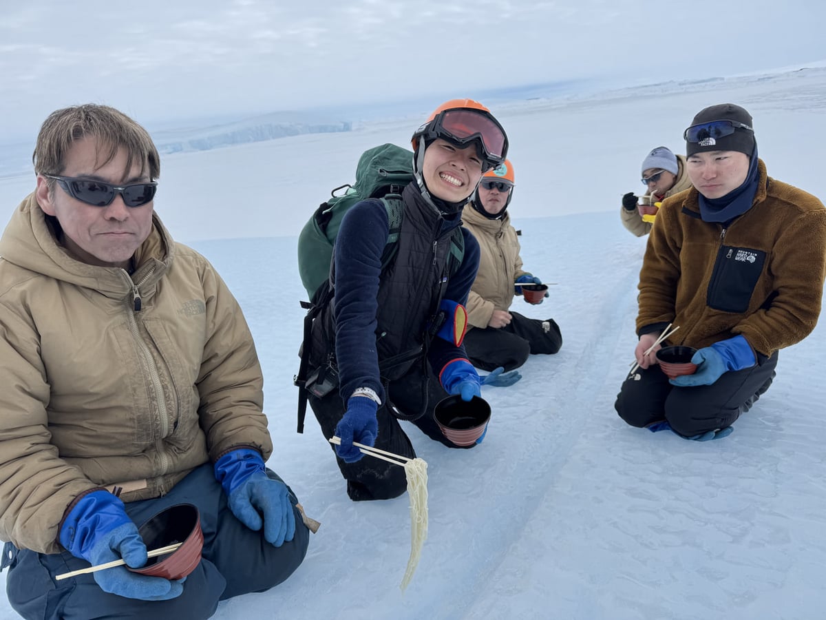 アイスオペレーションを終えた後に、同じ氷山の反対斜面を利用して流しそうめんを実施しました。予め溝を作っておいたのですが、数日経っていたのでちゃんと流れるのか不安でした。茹でたそうめんをお湯で流すと、ゆっくりゆっくり流れていきました。内陸ドーム旅行の直前ではあったのですが、準備等において隊全体の協力を得て、何とか実施することができました。これから忙しくなるその前に、野外で仲間達と過ごせた時間はとても良い気分転換になりました。