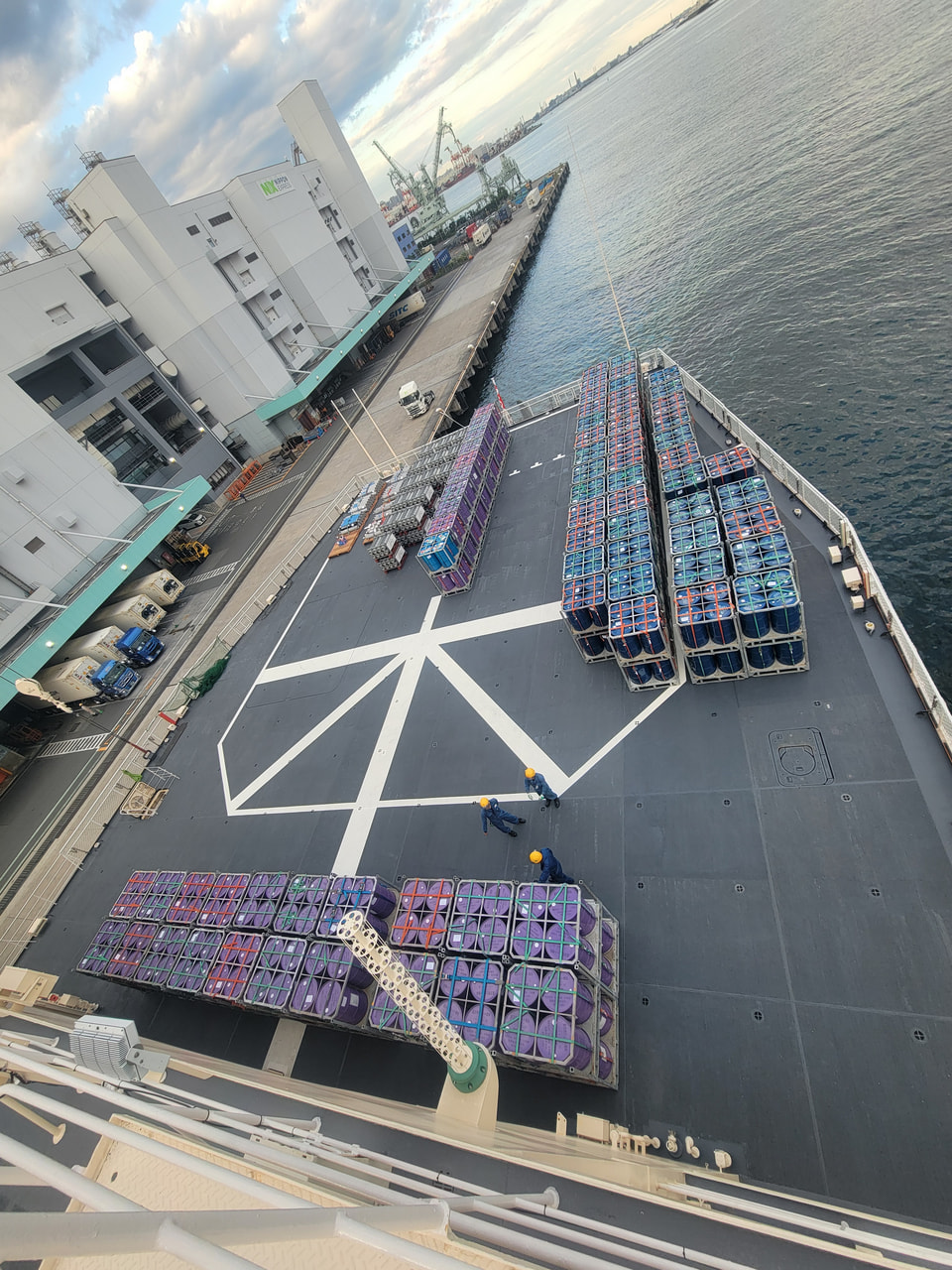燃料など危険品と呼ばれるカテゴリの物資は、納品されたその日中に全てしらせに積み込まなければなりません。(危険品は日をまたいで岸壁に置いておくことができないため)例年危険品をまとめて岸壁に納品してもらい、それらを全て1日でクレーンで飛行甲板に揚げています。