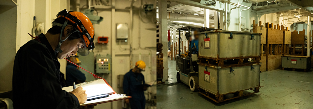 しらせの後部貨物倉は構造上、右側にやや寄った作りになっているので、積込みが進んでいくと少しだけ右に傾いていきます。船が傾くと荷物の積込みにも支障がでるため、到着後の輸送スケジュールや物資重量のバランスを見つつ、艦側と相談しながら搭載場所を決定しています。輸送担当の工夫が光るポイントです。