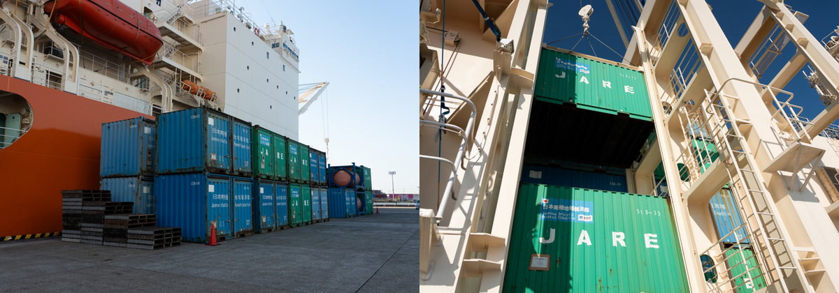 またコンテナ積込み作業と並行して、船倉への物資搭載も行われていました。越冬物資など主に昭和基地に着いてから使用するものはこの写真にあるスチールコンテナに梱包され南極まで運ばれていきます。