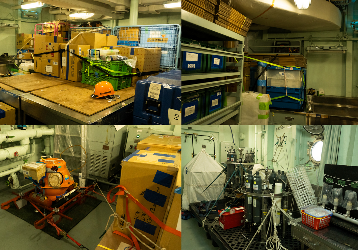 南極到着後に出番がある荷物は「しらせ」船倉に積み込まれますが、航海中に使う船上観測の機器類や私物はダンボールの状態でしらせに積み込みます。