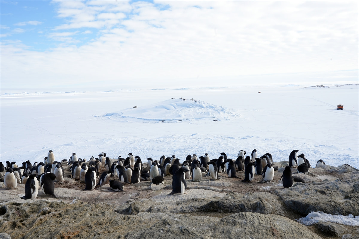 今月初めに先遣隊で到着した國分隊員、安達隊員、齋藤隊員のペンギンチームは早速調査を開始しています。そして越冬隊の小川隊員を中心とするペンギンセンサスを行うチームも活動を開始しました。11月15日にペンギン調査として2チームが並行して活動を行ったので、その調査に同行しました。ペンギンチームはまめ島に、ペンギンセンサスチームはまめ島とオングルカルベンに向かいました。往路は一緒に雪上車に乗り、調査中は一旦別行動をして、復路で再び合流して昭和基地に戻りました。