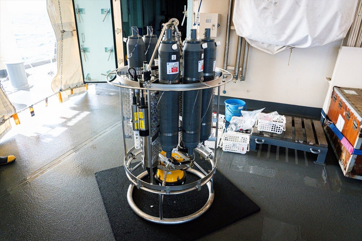 海水を採取するボトルと海水の塩分や温度を測るセンサーを取り付けたCTD採水システムと呼ばれる装置に、海流の向きと速さを測るLADCP(Lowered Acoustic Doppler Current Profiler)という機器を搭載した装置です。グレーのニスキンボトルは特定の深度(正確には水圧)で上下の蓋が閉じるようになっており、目的の深さの海水を採取することができます。