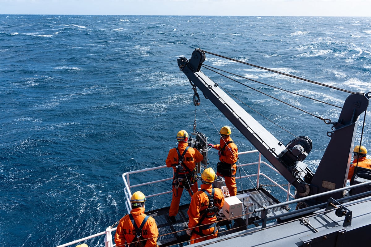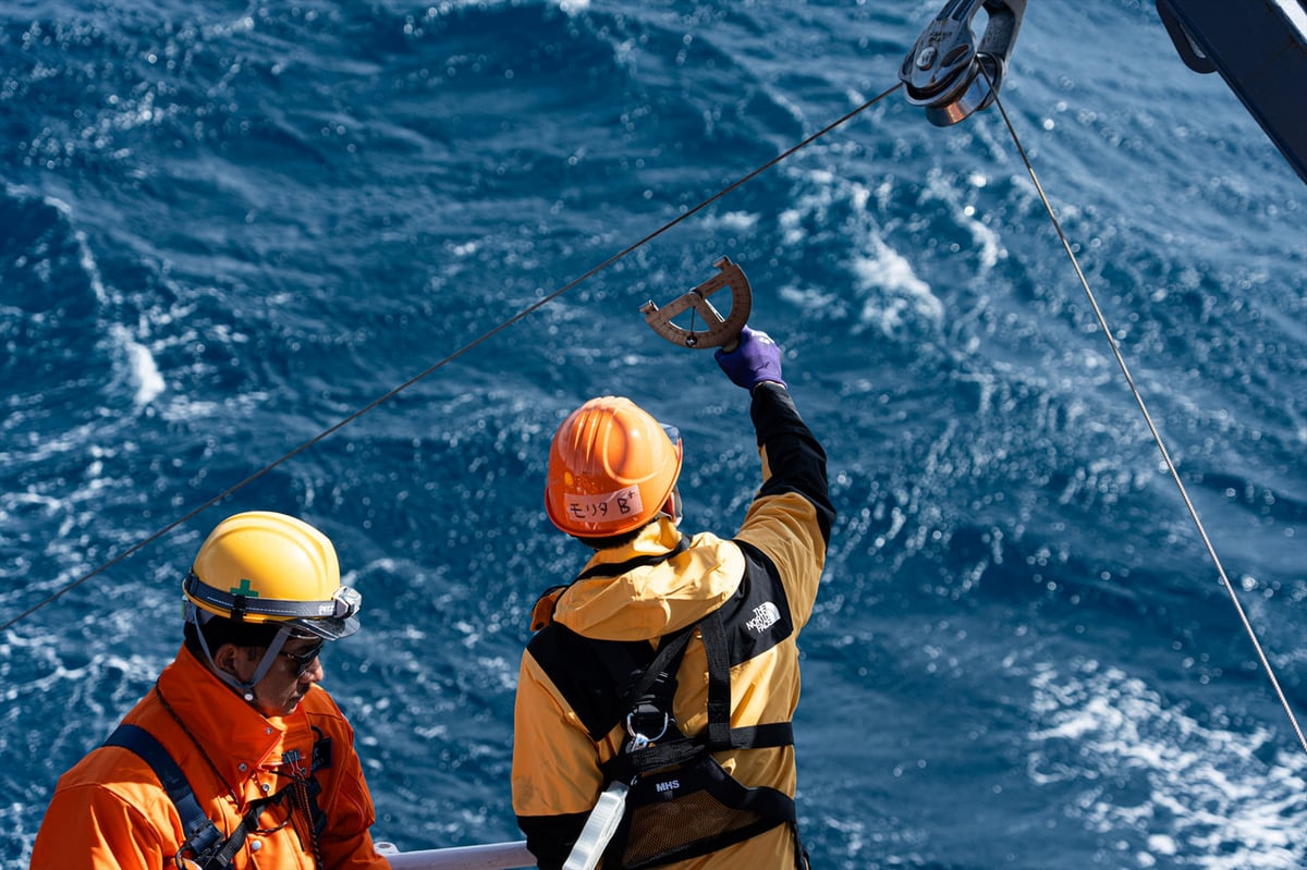 目標の深度に到達するよう、ワイヤーの角度を測って巻き出す長さを決めます。