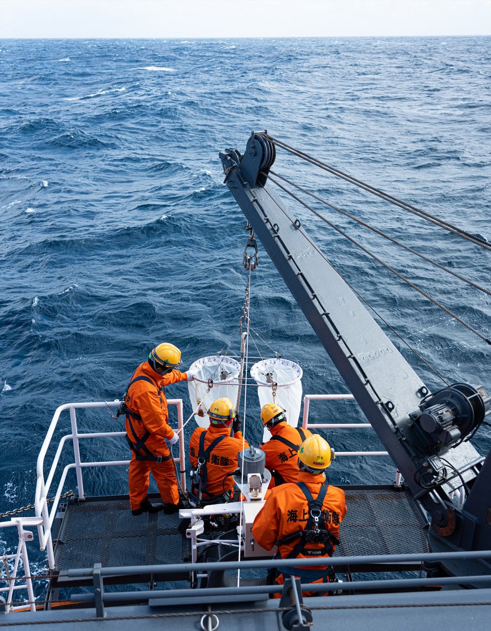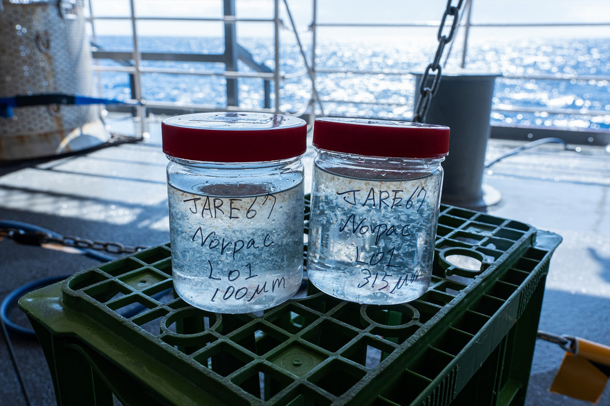 ネットを使ったプランクトン採集も行っています。ノルパックネットは任意の深度から引き上げることで、ネットが到達した深度〜海の表層までのプランクトンをがばっと筒状に採集することができるシステム。網目の細かさの違うネットを二つ並べて使っており、それぞれ別のサイズのプランクトンを採集することができます。