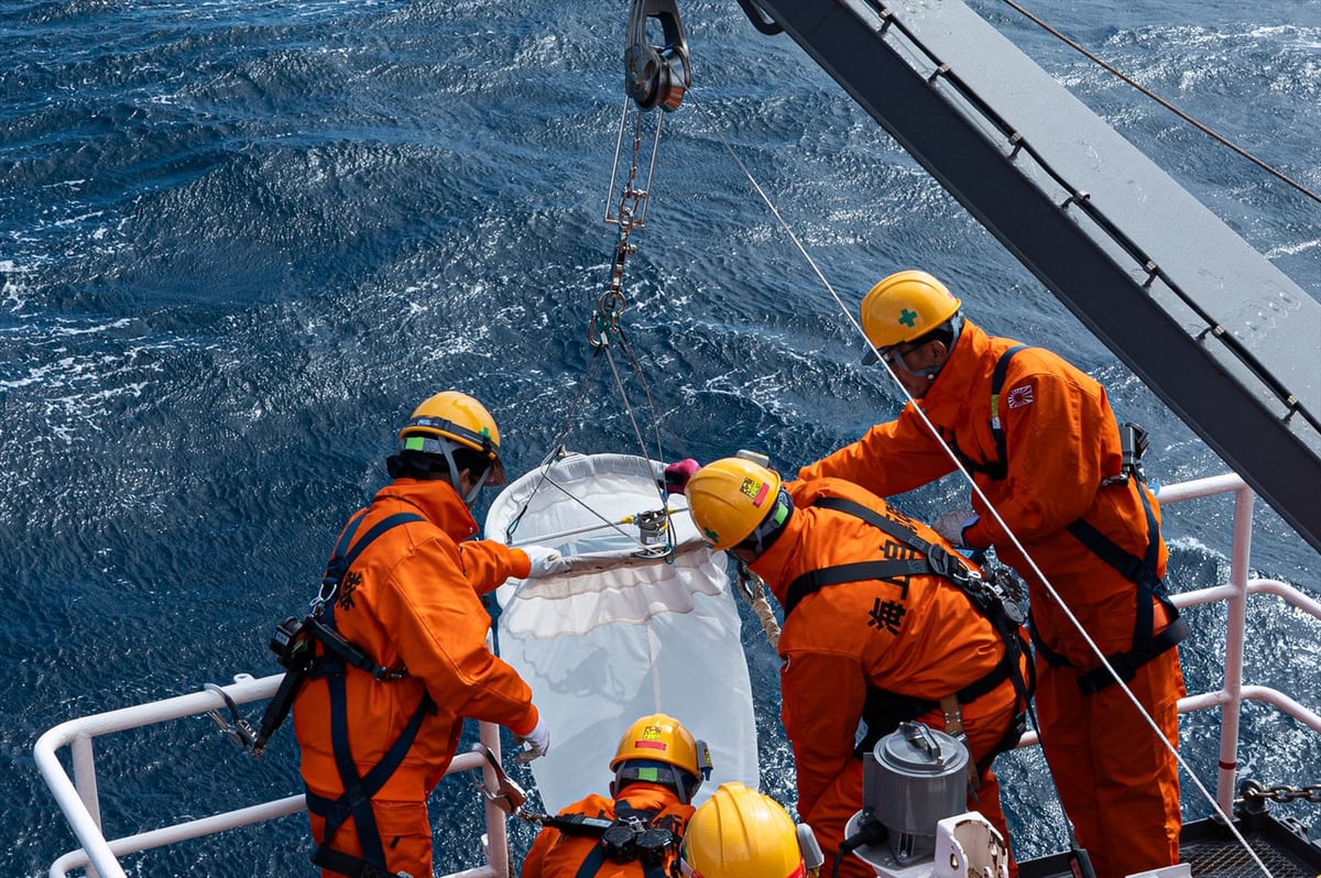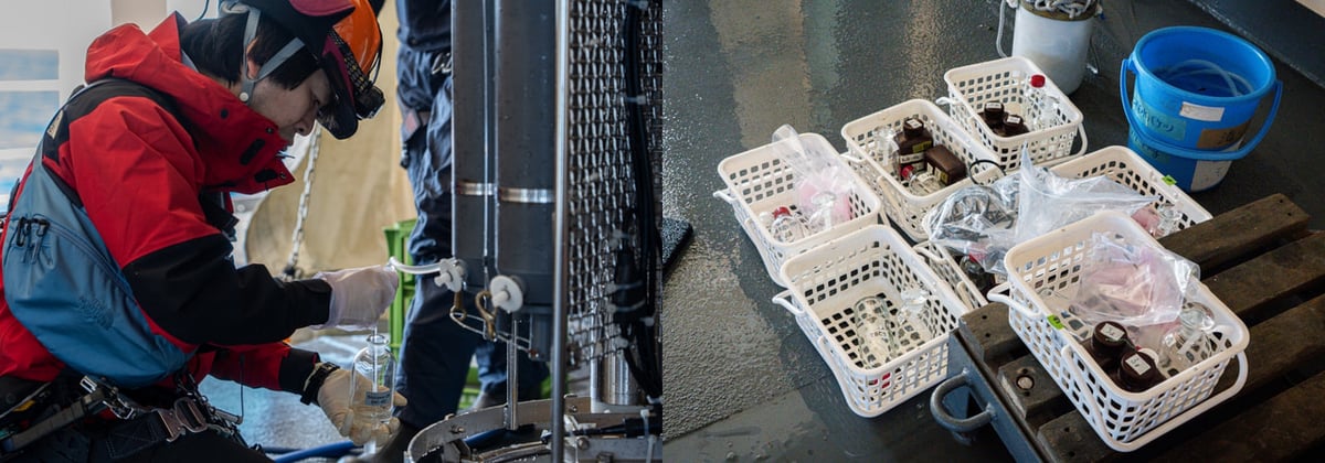揚収後はただ水を集めれば良いというだけではなく、この後測定したい項目ごとに決められた手順で採水する必要があります。あまり外気に触れさせたくないものはチューブを使うなど、採水方法も容器も様々です。