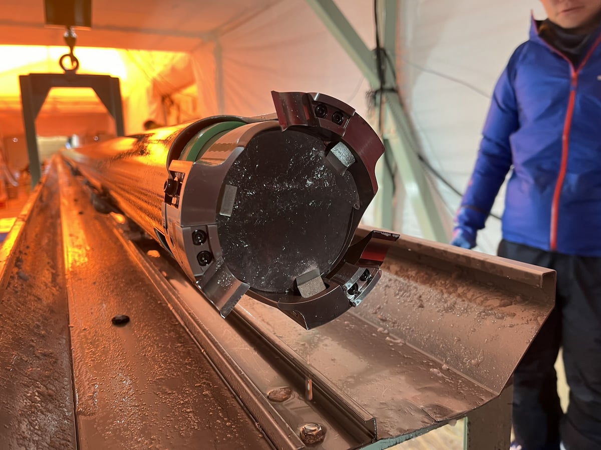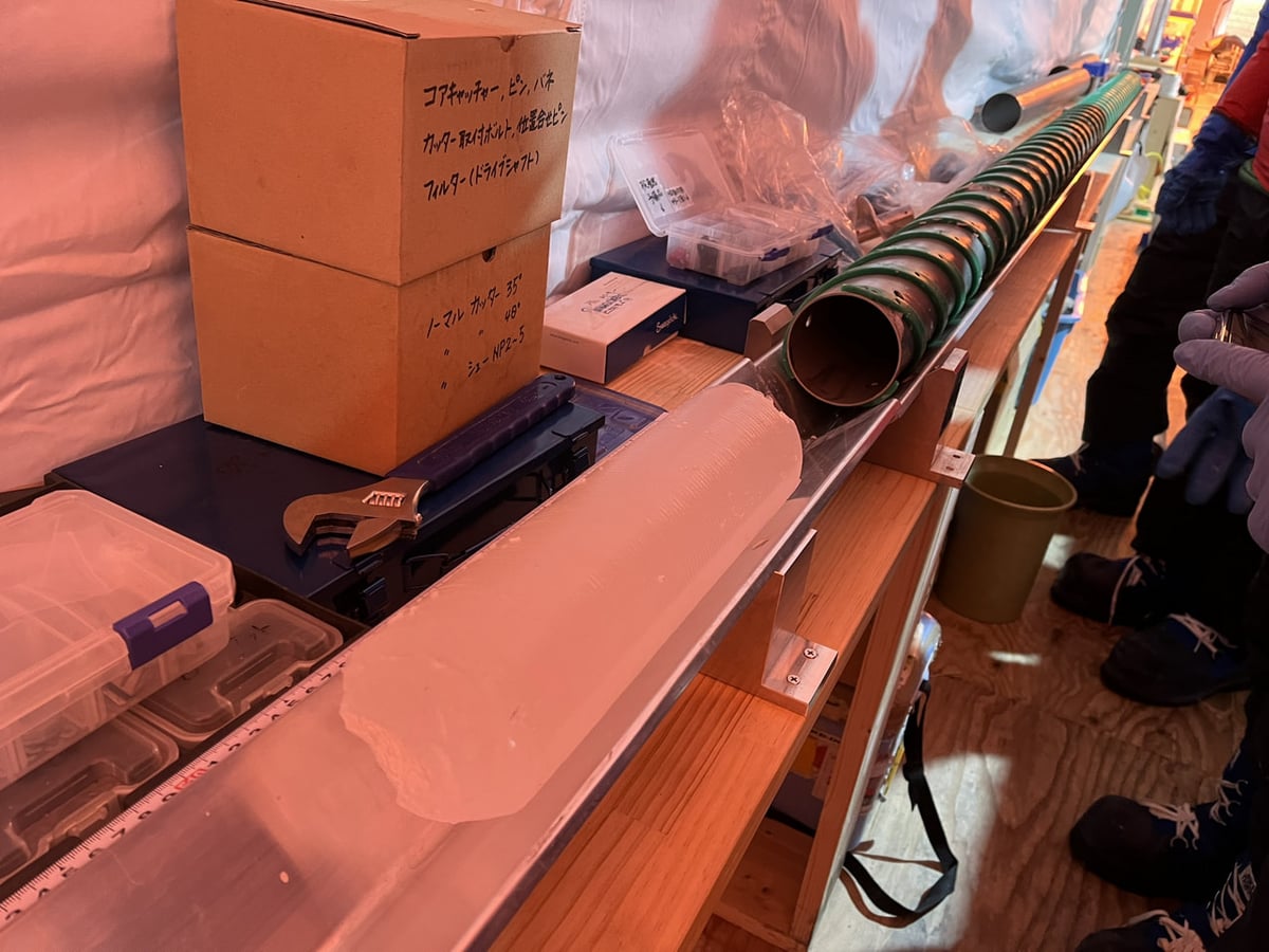掘削チームとコア解析チームが見守る中、綺麗なアイスコアがコアバレルから出てきました。昨シーズンの最後に掘削したコアと連続性を保っています。これを機に、掘削が滞りなく進むことを願うばかりです。