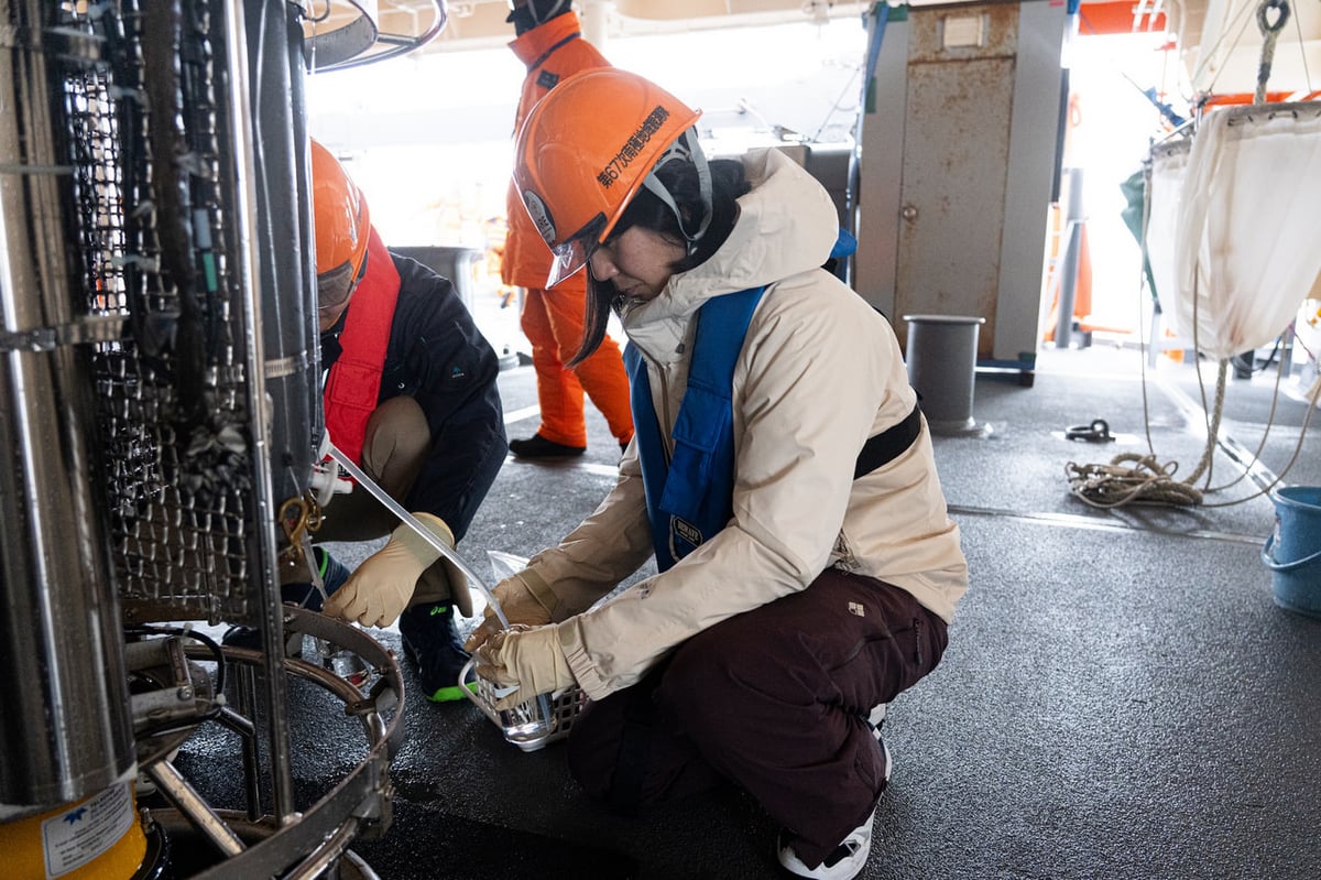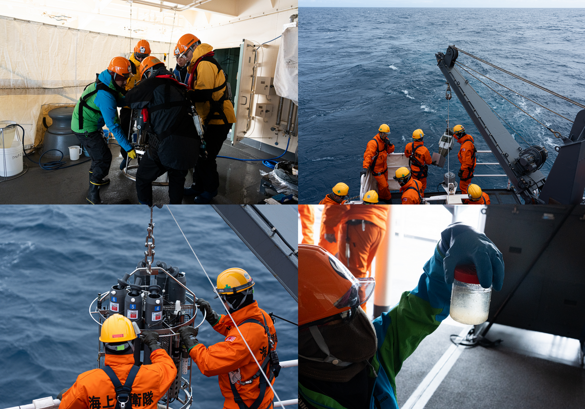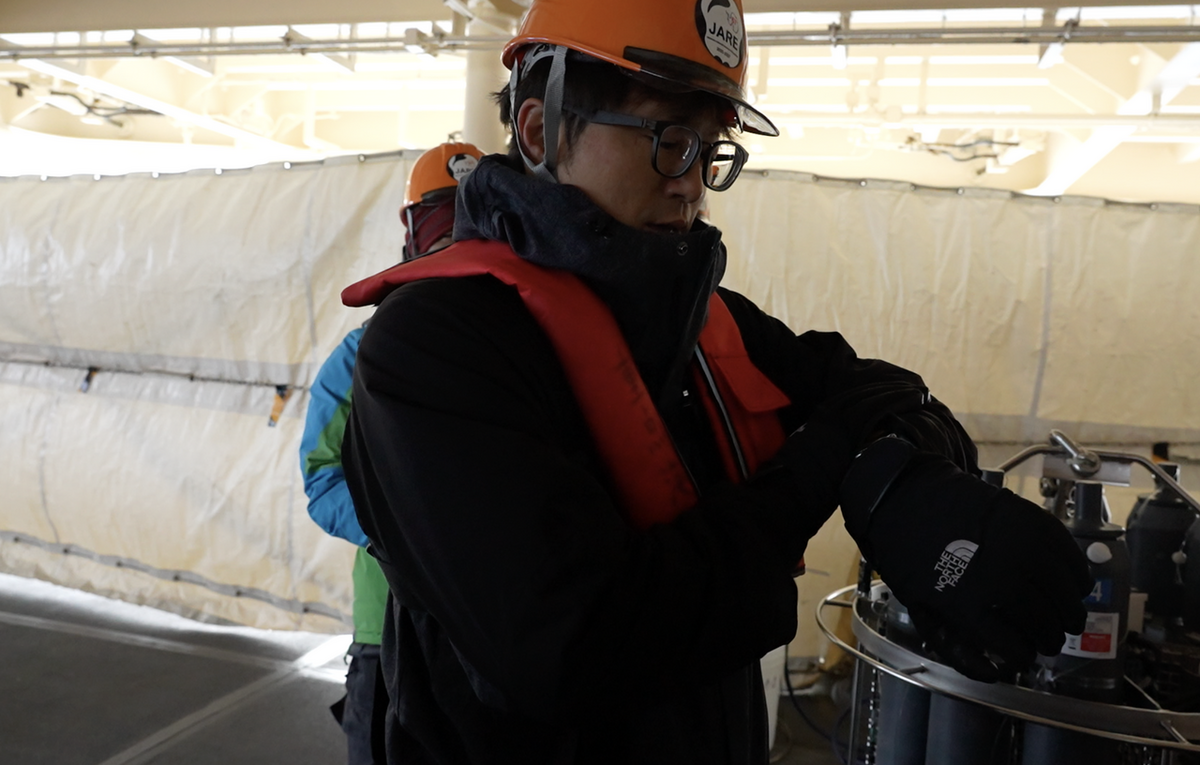 南緯55度入りを告げる船内放送が流れた朝の7時半頃は、ちょうど海洋観測が始まる時間。「しらせ」船尾の観測甲板では多くの隊員・しらせ乗員が作業にあたっているところでした。