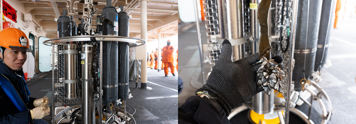 海洋チームではまったくわからずお手上げだったため、海に返そうとしていたところ「それもらってもいいですか?」との声が。手を挙げたのは観測の様子を見学していた採泥チーム&サンゴの研究者の千徳隊員です。カメノテのような何か...は、おそらくエボシガイの一種ではないかとのことでした。