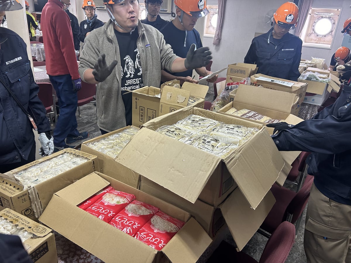12月16日から17日にかけて、船内で野外糧食の配布を行いました。野外糧食、とは昭和基地から離れ大陸沿岸などで観測や設営を行う隊員のキャンプ中の食料をいいます。野外に出るのは14チームほど。中には2週間以上昭和基地に戻らず観測し続けるチームもあり、また不測の事態(ブリザードによる延泊など)も加味して予備分も含めた配布となるため、チームメンバー数名分の朝昼晩の食料となるとかなりの量です。