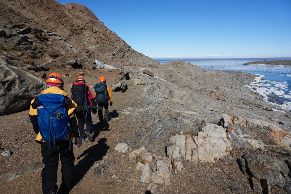 12月31日の大晦日、昭和基地から南に約50kmにある露岩域のスカルブスネスを拠点に活動しているペンギンチームの観測に同行しました。現在活動中のペンギンチームは3名で、毎日キャンプ地のあるきざはし浜からアデリーペンギンのルッカリー(=ペンギンが多数集って繁殖する群生地)のある鳥の巣湾まで片道約1時間の道のりを徒歩で通っています。
