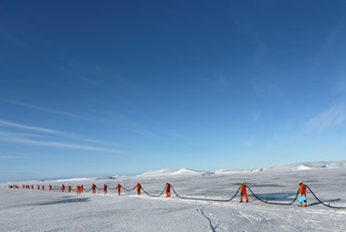 27日の朝、「しらせ」の接岸完了を待たずして昭和基地側でのホース展張作業が始まりました。66次隊と67次隊が協力して作業を進めます。接岸後は新しく買い足した分を含めて「しらせ」側のホースの展張作業もスタートし、多くの「しらせ」乗員の協力により、ホースが伸びていきました。