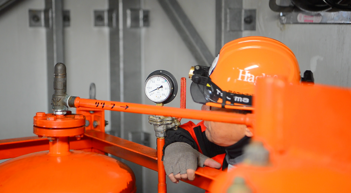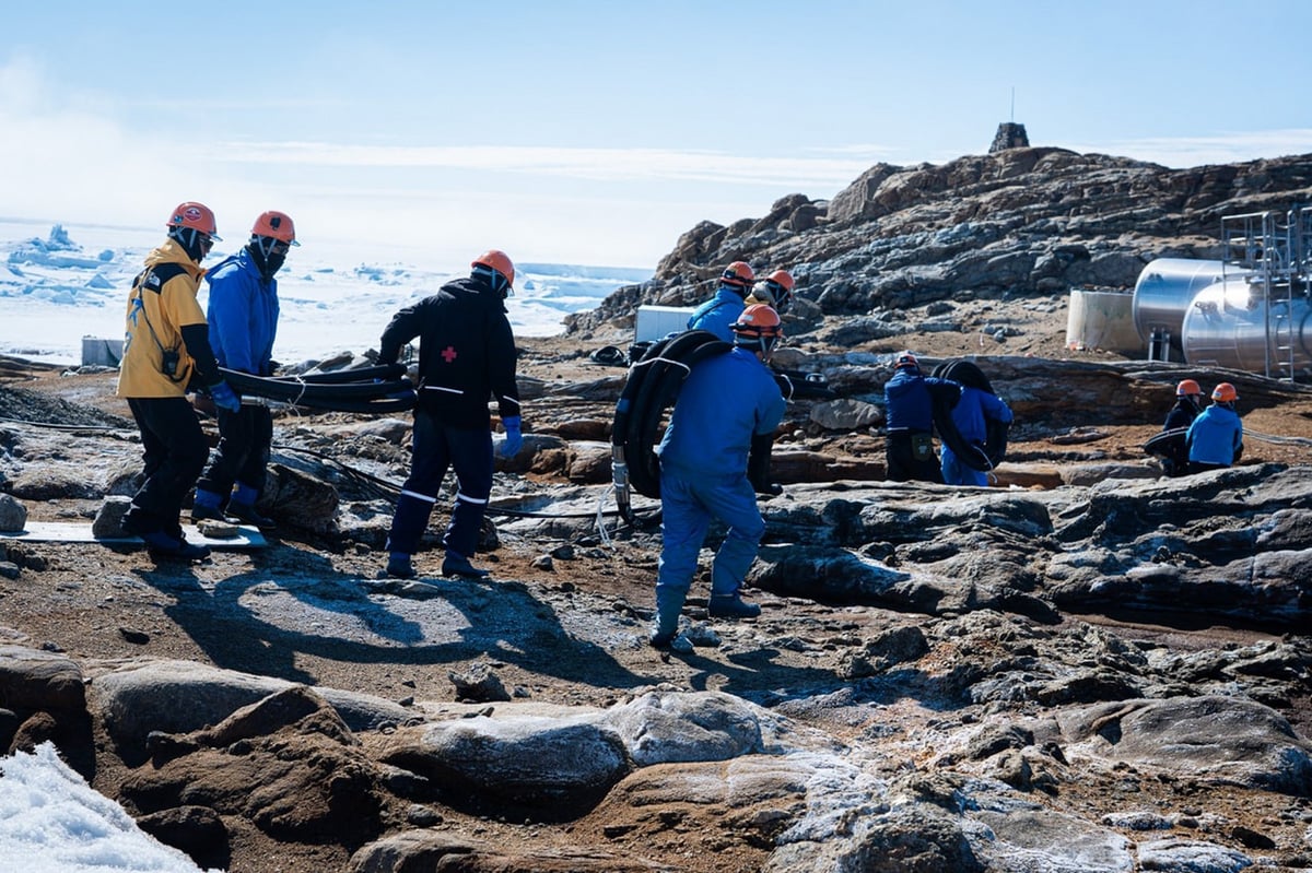 そして27日の21時過ぎ、無事にホースが「しらせ」のタンクから昭和基地側のタンクにつながりました! 最終的な長さは2595mとなりました。ホースが長くなった分、元々基地内のタンク間の移送に使用していたポンプを「しらせ」からの燃料引き込み用として接続する工夫も光り、安定した流量で基地側タンクに到達しました。ここからいよいよ燃料ホース輸送のスタートです。夏期間の観測や越冬生活に必要な700klの燃料を、24時間体制で送油します。