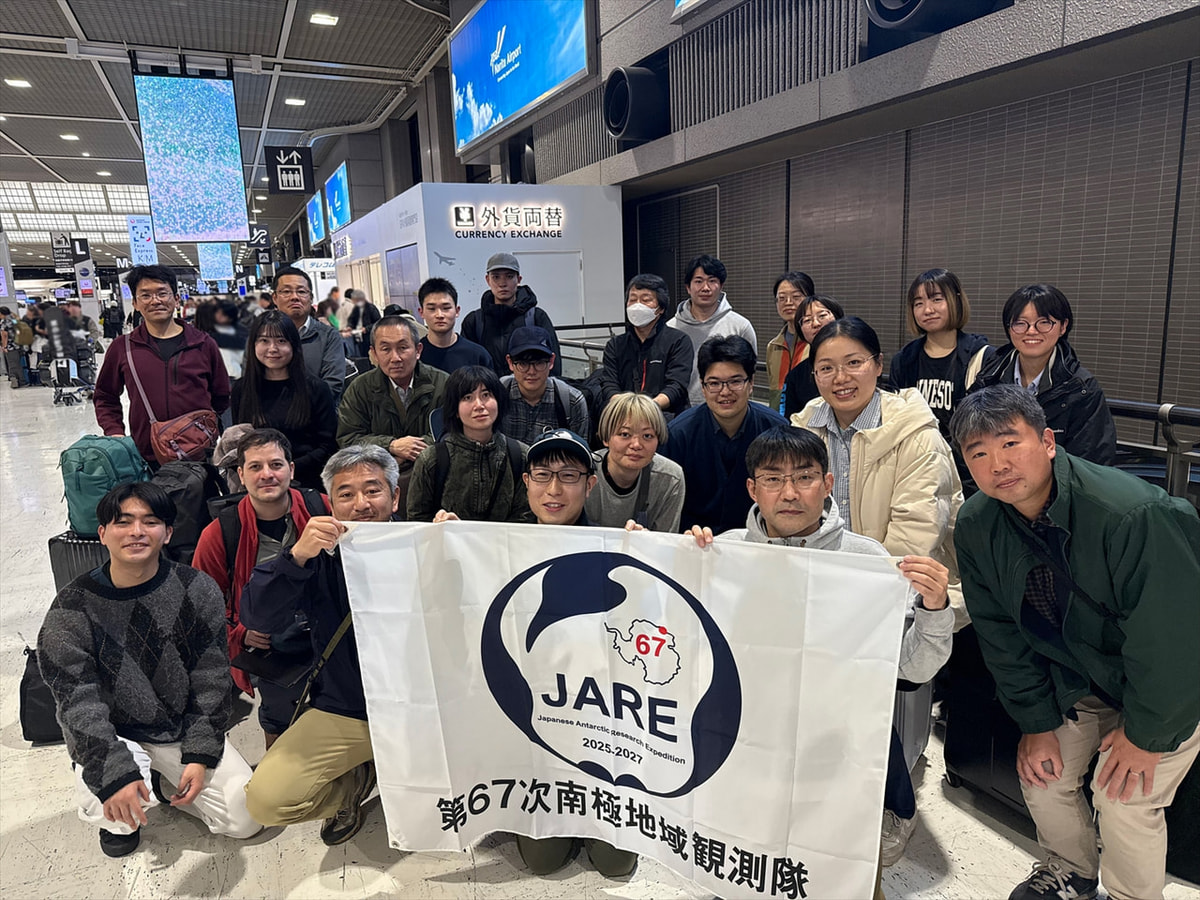 別動隊、出発! 2026年1月 7日 カテゴリ: JARE67 海鷹丸 1月6日夜、67次隊の別動隊11名が成田空港から出発しました!オーストラリアのフリーマントル港で東京海洋大学の練習船「海鷹丸」に乗船し、南極海での海洋物理・化学の観測や、トッテン氷河沖での集中観測を実施します。 別動隊メンバーと見送りの方々。撮影:国立極地研究所(2026年1月6日) (国立極地研究所広報室) Twitter Facebook 前の記事