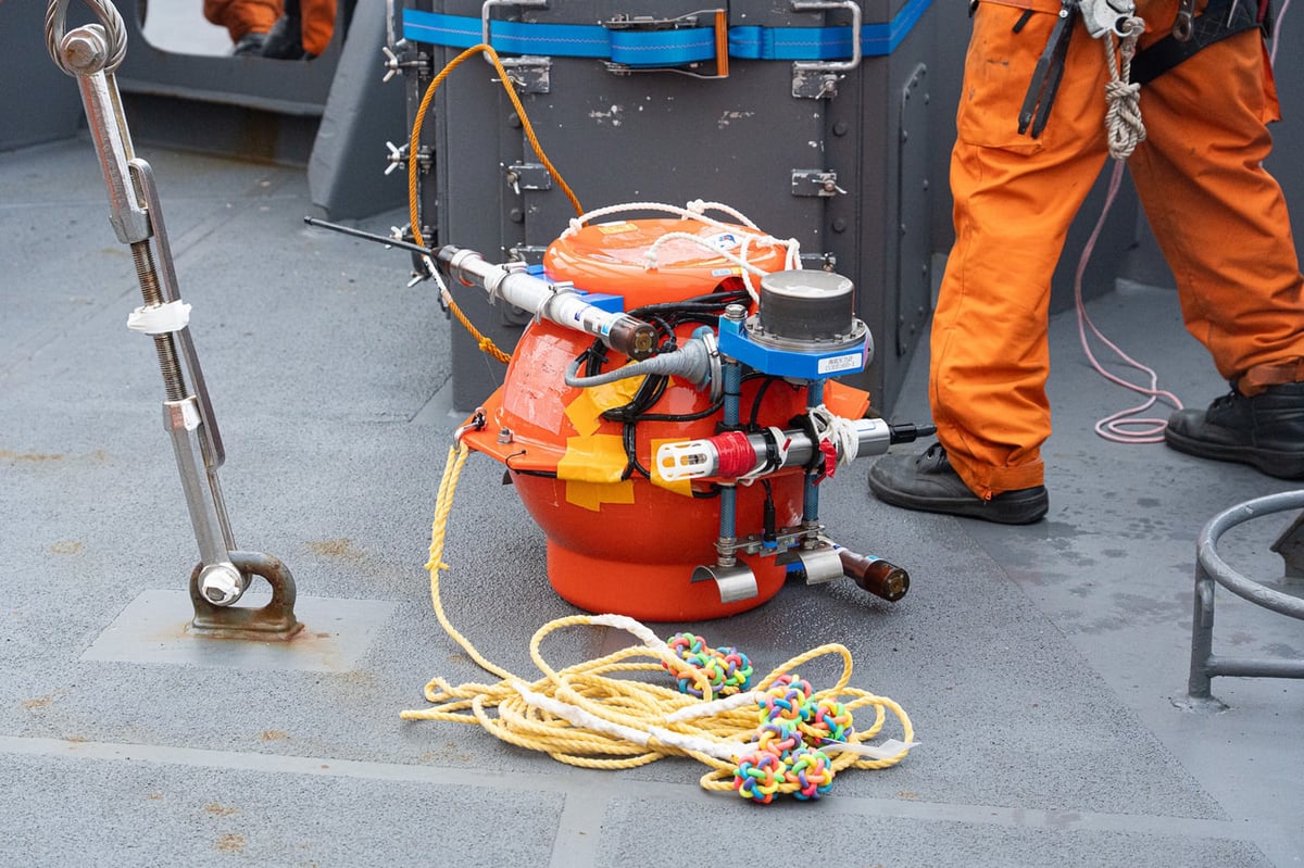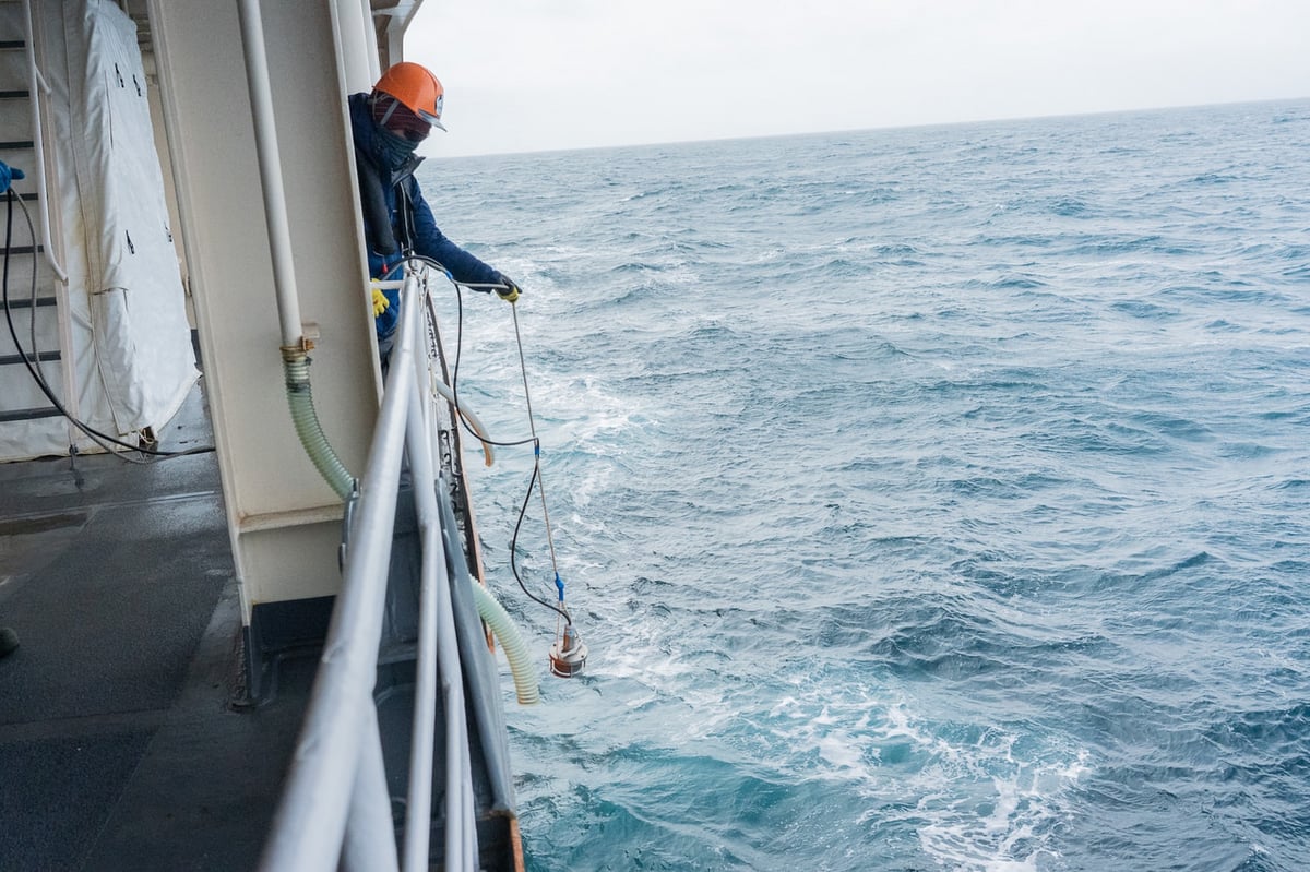そして2026年2月1日、一昨年66次隊が設置した海底圧力計の回収ミッションが行われました。電波の届かないほど深い海底に設置されている海底圧力計への指示は、音波を用いて行います。音響信号を送受信する「トランスデューサー」と呼ばれる装置を海中に投入し、まずは信号を送って反応があるかどうか、海底圧力計が正常に動作しているかを確認します。