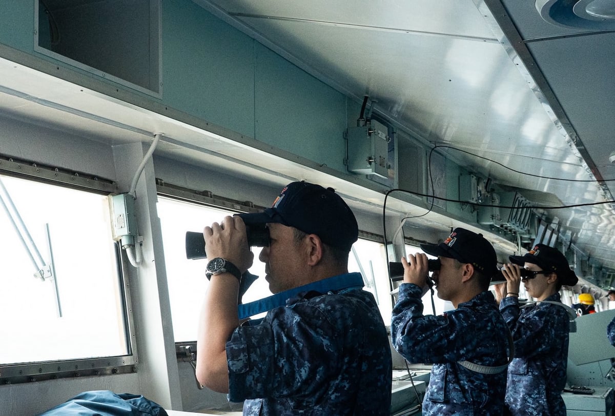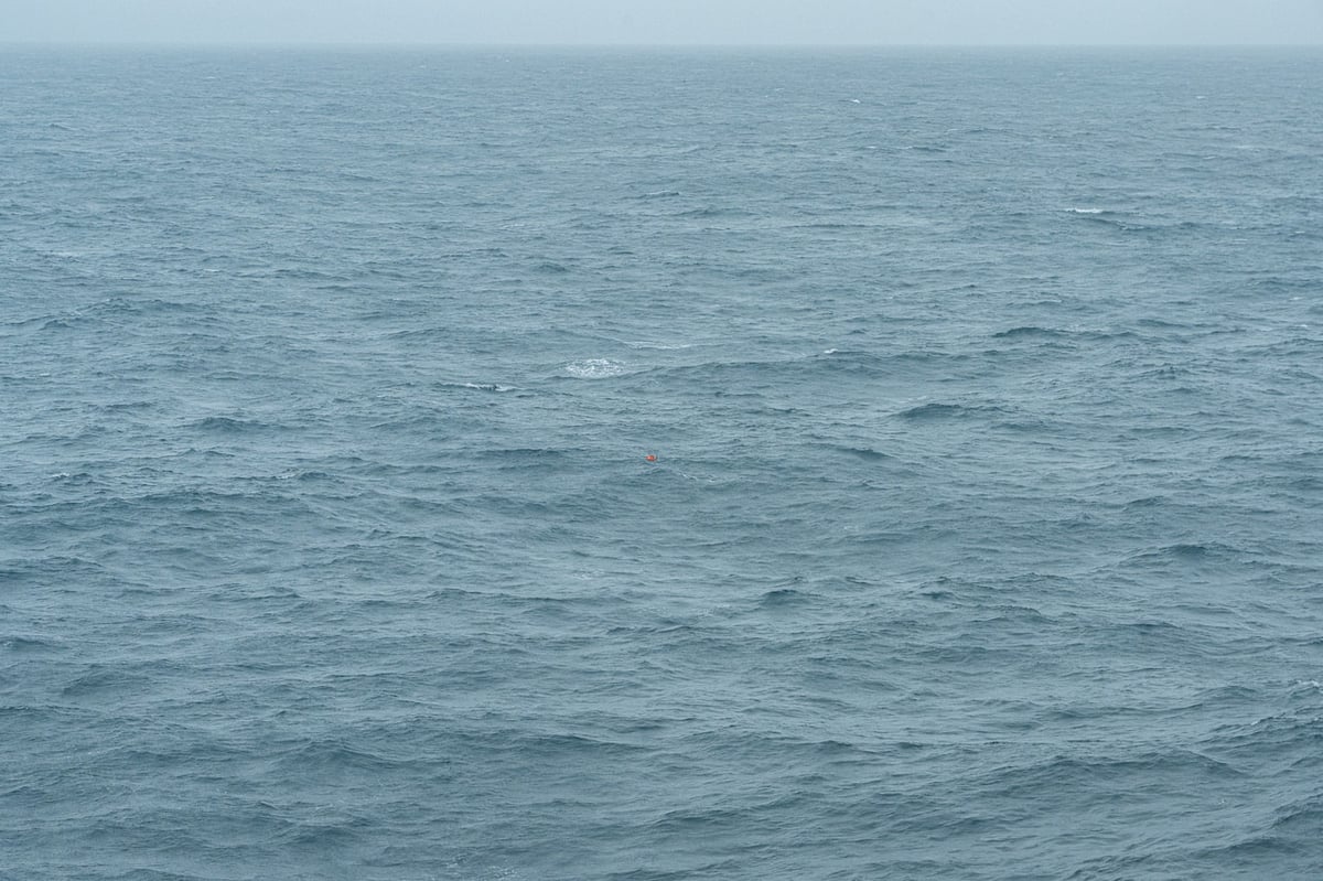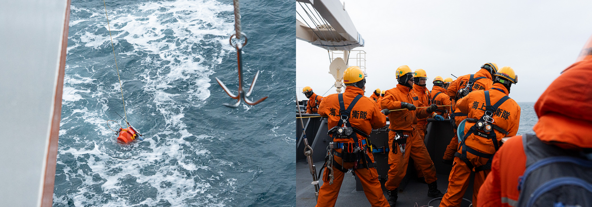 海底圧力計が頑張るのはここまで。後は海面に浮上してきた時に届く信号を合図に、双眼鏡を使って探します。揺れる海で小さなブイを探す作業に苦戦すると思っていたのですが、なんとほんの5分ほどでしらせ乗員の方が見つけてくれました。