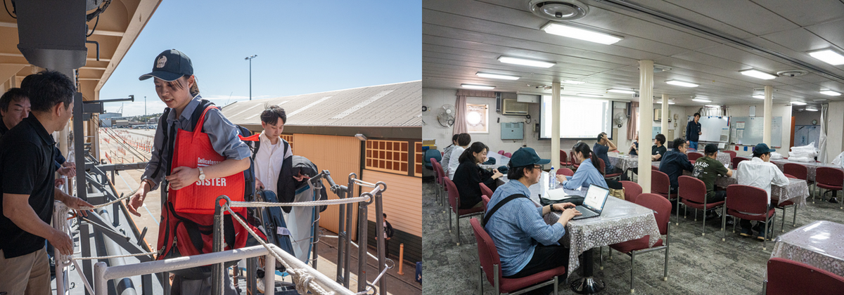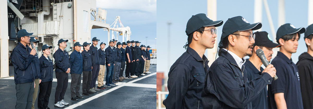 また翌日26日の出港前には、飛行甲板でレグ2乗船者と「しらせ」乗員の対面式を行いました。67次隊行動ではレグ2から新たにスタートする鉄観測リーダーの西岡隊員とAUV観測リーダーの山縣隊員から「しらせ」乗員の皆様に向けて意気込みをお話しました。