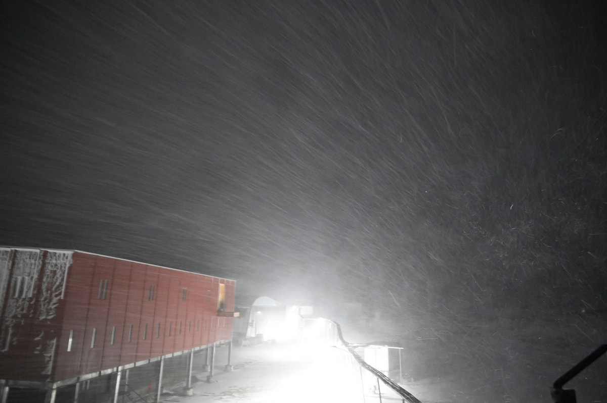 ブリザード中は屋外が非常に危険な状態となるため、外出注意令や外出禁止令が隊長判断で出されることがあります。外出注意令中は屋外での作業は禁止で、やむを得ず建物間を移動する必要がある場合は2人以上で、建物を繋ぐように張られた安全索・ライフロープ沿いに移動するなど制限が加わります。また外出禁止令では外出の一切が禁止されます。気象隊員は交代しながら基本観測棟での観測を実施していますが、外出禁止令中はブリザードが収まるまで人員交代ができず、基本観測棟に残った隊員がそのまま観測を継続します。今回のブリザードでは、外出注意令が3日昼から4日夕方まで出され、降雪が強まった4日の日中には外出禁止令も出されました。