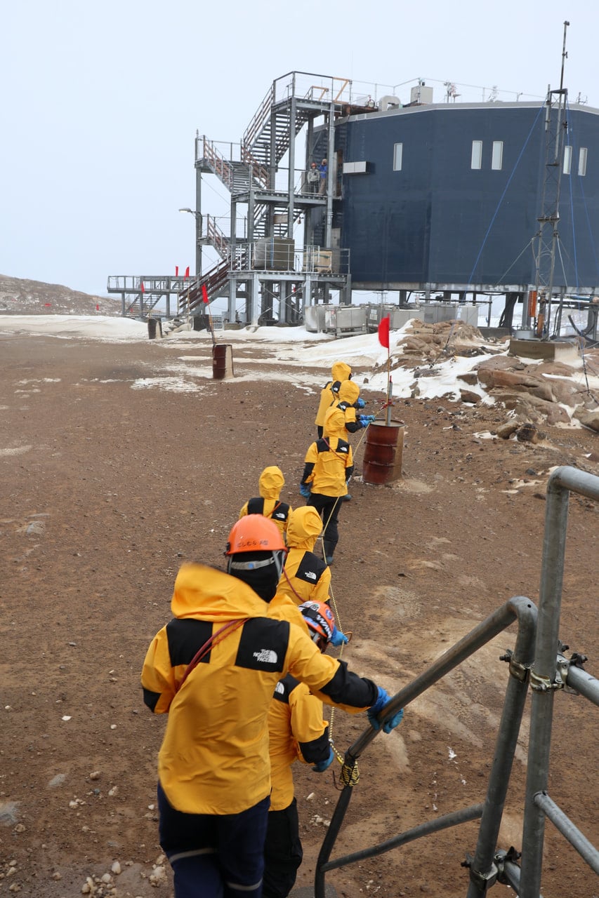 また、視程が改善した時間帯である4日朝には野外観測支援担当隊員により野外歩行訓練が実施されました。足元も雪があまり積もっていない状況下であり、今後も来るブリザードに備えて暴風に慣れるための訓練です。安全に配慮して基地主要部の建物間を300mほど歩き、ライフロープの使い方や暴風時の歩行を確認しました。この時の平均風速は約23m/s。参加者は万全の装備で臨みましたが、風に向かって歩くのはかなり大変です。