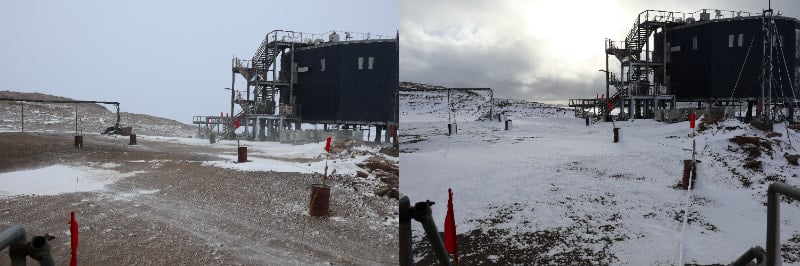 今回のブリザードは、最大平均風速27.8 m/s、最大瞬間風速36.0 m/sで、それぞれ4日朝に観測されました。最大平均風速27.8m/sは時速に直すと約100 km/hですので、高速道路を走る自動車とほぼ同じ速度で風が吹いていたことになります。風の強い時間帯は屋内にいてもゴー、ゴーッと風がぶつかる音が響き、建物も震えて少し恐怖を感じました。一方で視程は継続して低下せず、風が一番強い4日朝の時点ではまだ表のブリザード基準を満たすほどではありませんでした。降雪量や昭和基地周辺に元々積もっていた雪が少なかったことが影響していると考えられます。その後、風がピークを過ぎて弱まり始めてから雪がまとまって降りました。その際に視程が低下してブリザード基準(C級)を満たしました。