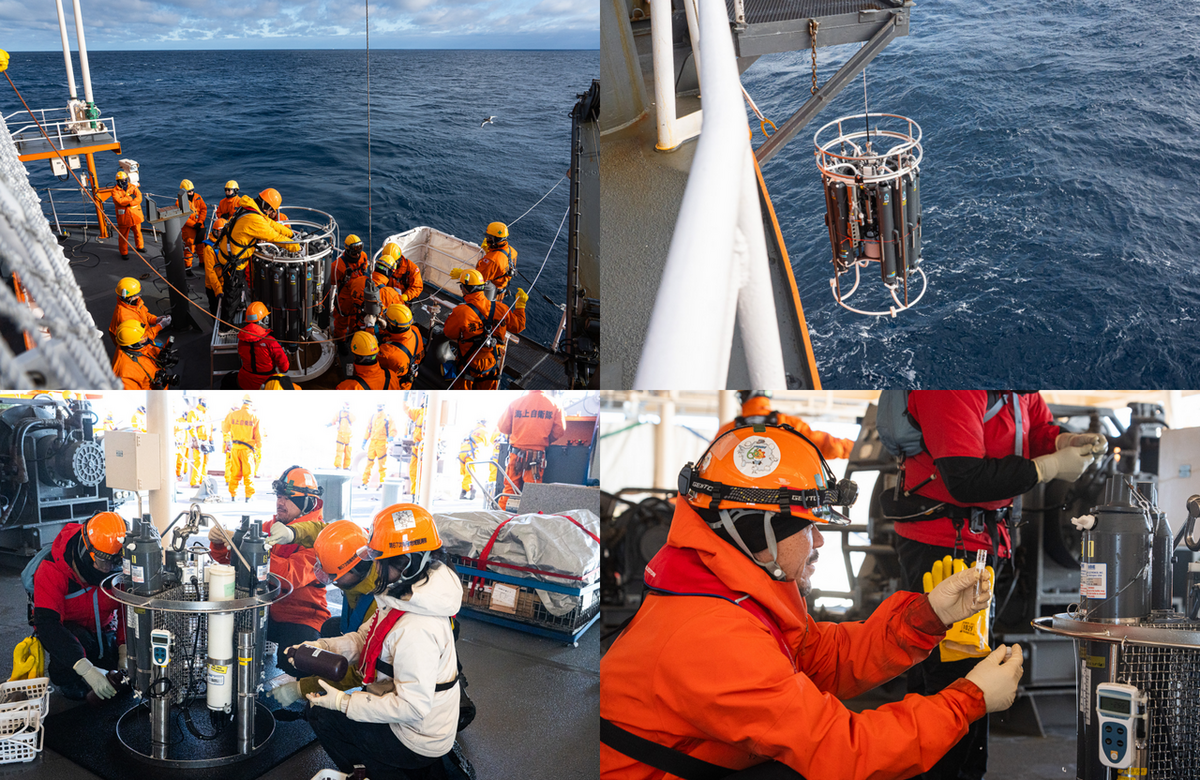集中観測1日目から観測メニューが盛りだくさん!レグ2から始まった鉄観測を含む基本の海洋観測各種(CTD/LADCP/がま口ネット)のほか、こちらも67次隊行動ではレグ2からスタートする観測である自律型水中ロボット(AUV)「MONACA」の浮力調整や測線航走による海底地形調査・高精度XCTD観測が行われました。