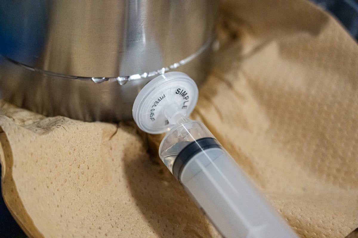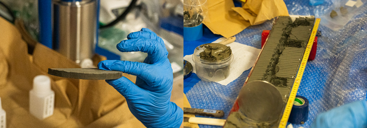 堆積物コアは1cmごとにカットし、その一部を間隙水の抽出に使用します。層ごとに抽出することで年代の異なる試料を得ることができます(右)