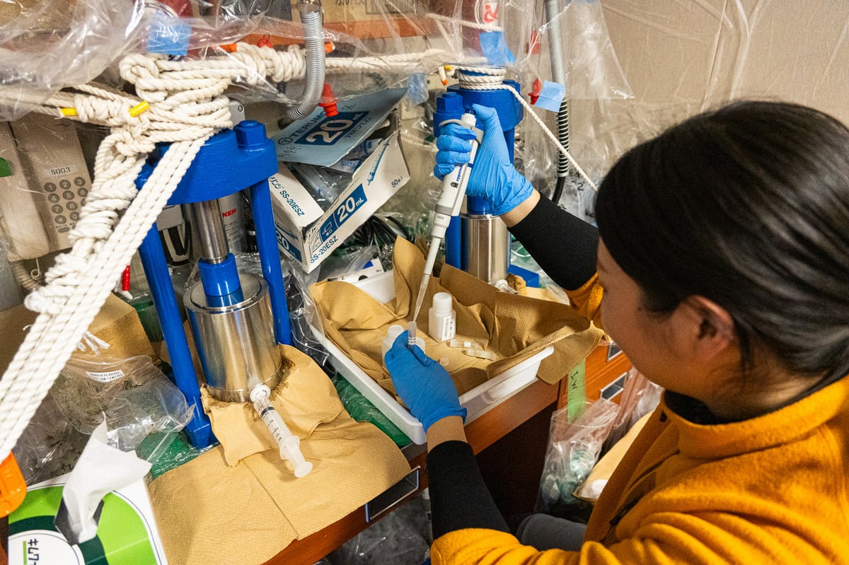 採取したコアの活用方法は前回のブログでご紹介した通りですが、レグ2から新たに、堆積物コアから「間隙水(かんげきすい)」を抽出する作業が始まりました。